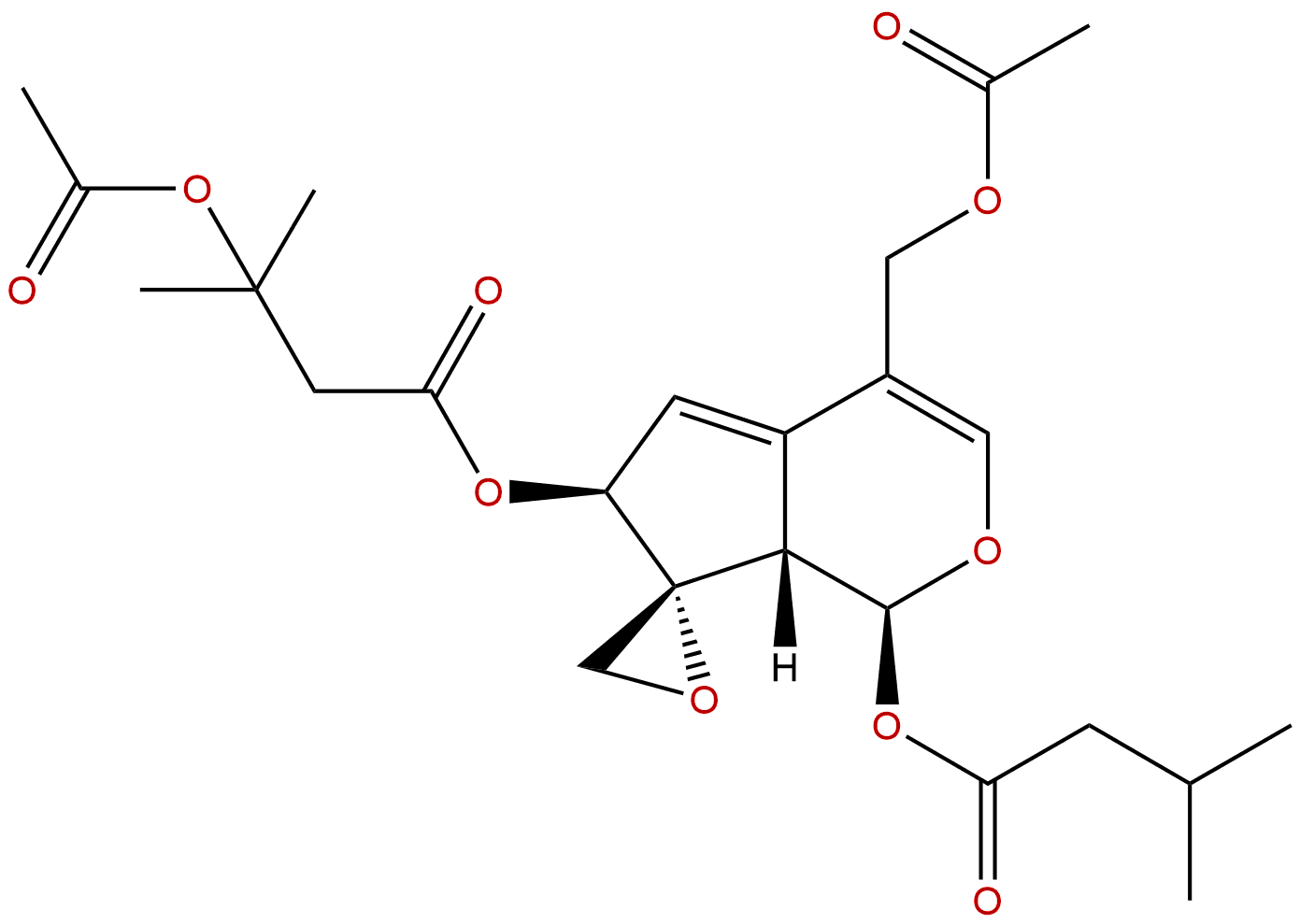IUPAC Name: [(1S,6S,7R,7aS)-4-(acetyloxymethyl)-1-(3-methylbutanoyloxy)spiro[6,7a-dihydro-1H-cyclopenta[c]pyran-7,2′-oxirane]-6-yl] 3-acetyloxy-3-methylbutanoate