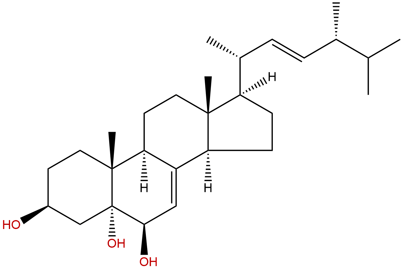 Synonyms: Cerevisterol; 516-37-0; Cerevisterin; 6MHQ9J8E6J; CHEBI:68083; (3S,5R,6R,9S,10R,13R,14R,17R)-17-[(E,2R,5R)-5,6-dimethylhept-3-en-2-yl]-10,13-dimethyl-1,2,3,4,6,9,11,12,14,15,16,17-dodecahydrocyclopenta[a]phenanthrene-3,5,6-triol; Ergosta-7,22-diene-3,5,6-triol, (3beta,5alpha,6beta,22E)-; 5alpha-Ergosta-7,22-diene-3beta,5,6-triol; …