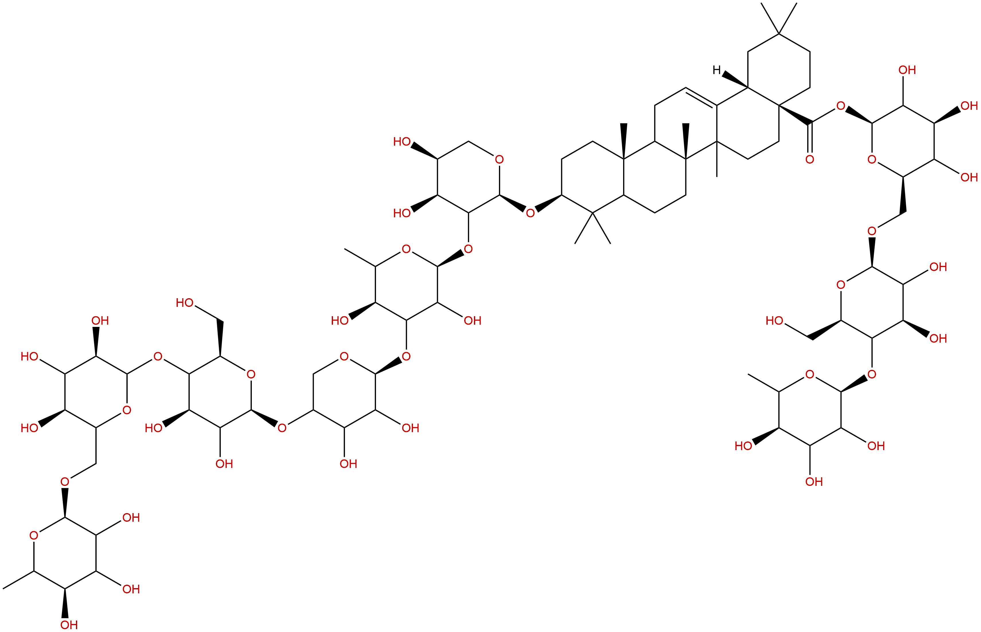 Isomeric SMILES: C[C@H]1[C@@H]([C@H]([C@H]([C@@H](O1)OC[C@@H]2[C@H]([C@@H]([C@H]([C@@H](O2)O[C@@H]3[C@H](O[C@H]([C@@H]([C@H]3O)O)O[C@@H]4CO[C@H]([C@@H]([C@@H]4O)O)O[C@@H]5[C@H]([C@@H](O[C@H]([C@@H]5O)O[C@@H]6[C@H]([C@H](CO[C@H]6O[C@H]7CC[C@]8([C@H](C7(C)C)CC[C@@]9([C@@H]8CC=C1[C@]9(CC[C@@]2([C@H]1CC(CC2)(C)C)C(=O)O[C@H]1[C@@H]([C@H]([C@@H]([C@H](O1)CO[C@H]1[C@@H]([C@H]([C@@H]([C@H](O1)CO)O[C@H]1[C@@H]([C@@H]([C@H]([C@@H](O1)C)O)O)O)O)O)O)O)O)C)C)C)O)O)C)O)CO)O)O)O)O)O)O