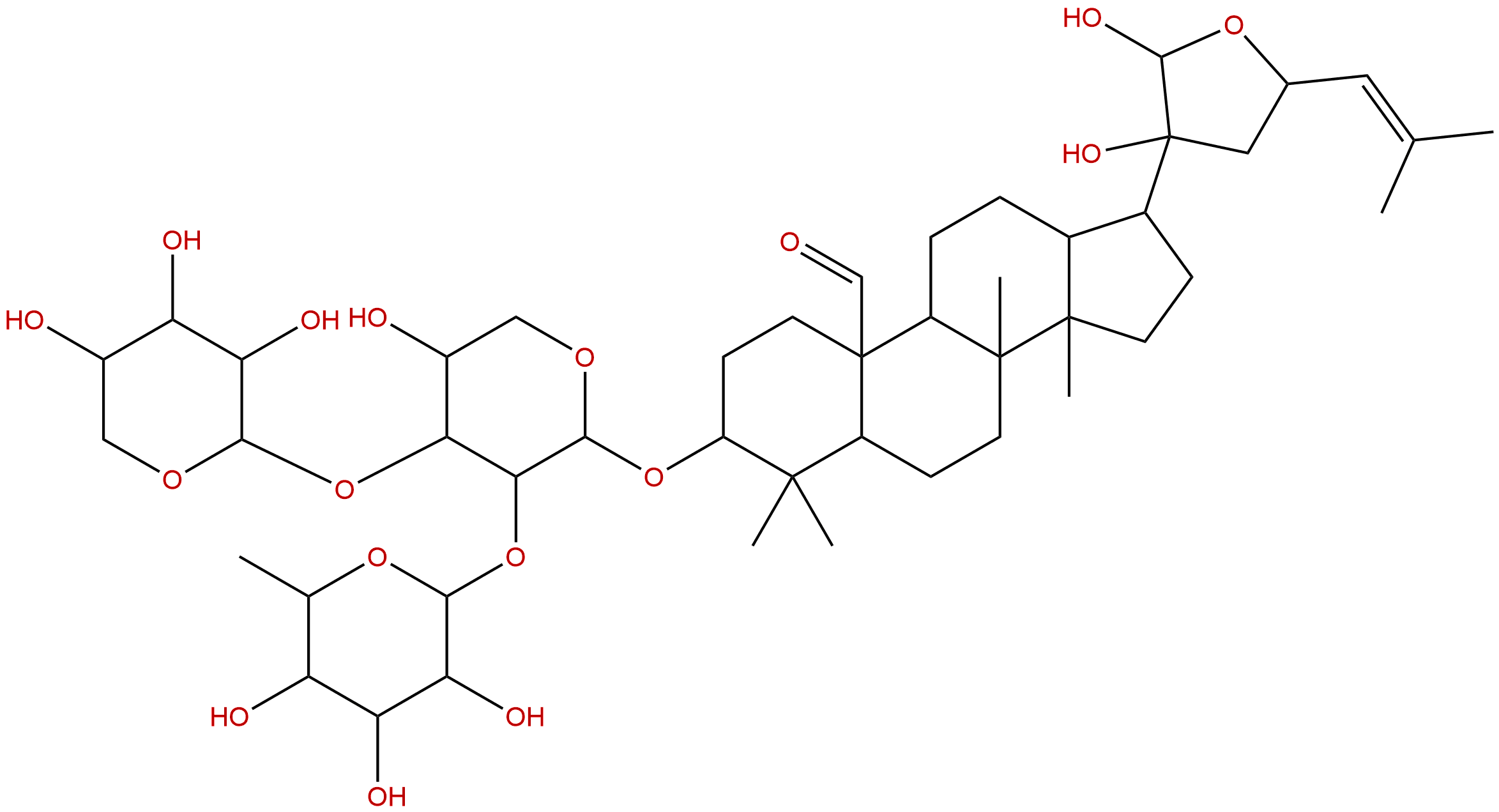 IUPAC Name: 17-[2,3-dihydroxy-5-(2-methylprop-1-enyl)oxolan-3-yl]-3-[5-hydroxy-3-(3,4,5-trihydroxy-6-methyloxan-2-yl)oxy-4-(3,4,5-trihydroxyoxan-2-yl)oxyoxan-2-yl]oxy-4,4,8,14-tetramethyl-2,3,5,6,7,9,11,12,13,15,16,17-dodecahydro-1H-cyclopenta[a]phenanthrene-10-carbaldehyde