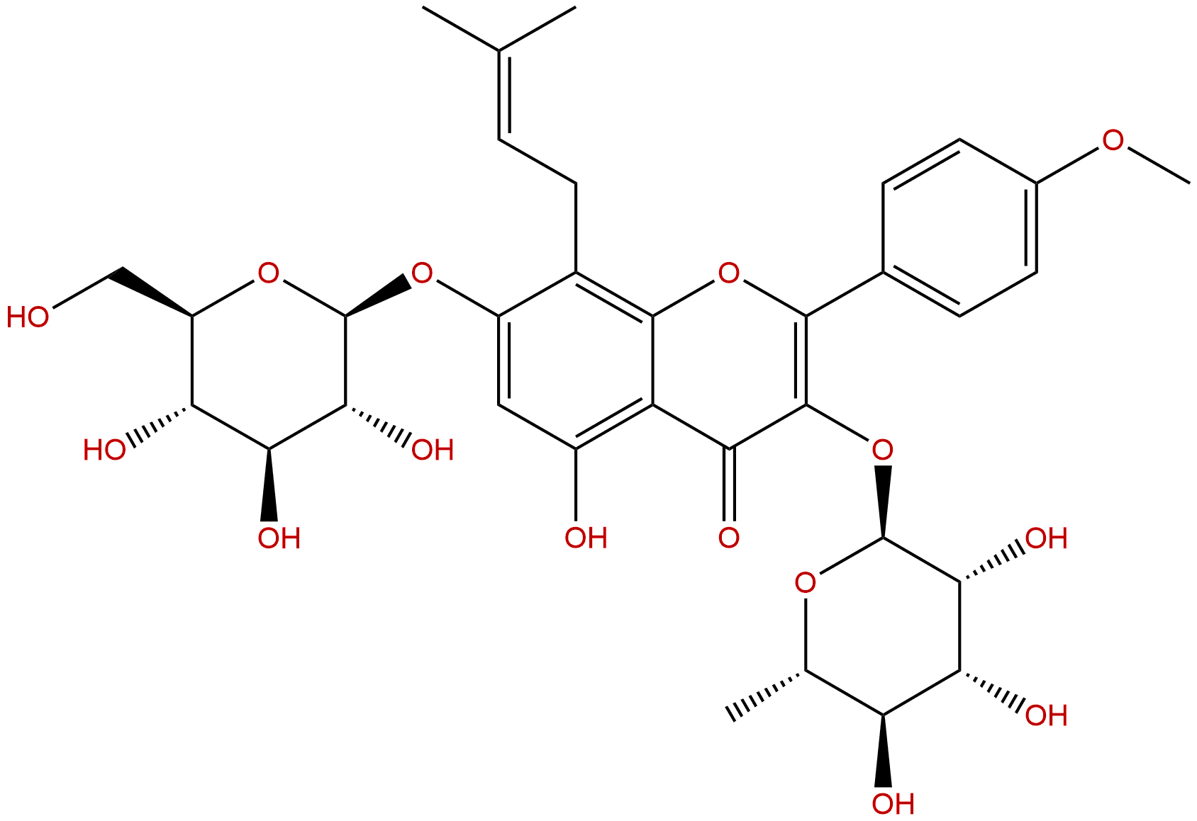IUPAC Name: 5-hydroxy-2-(4-methoxyphenyl)-8-(3-methylbut-2-enyl)-7-[(2S,3R,4S,5S,6R)-3,4,5-trihydroxy-6-(hydroxymethyl)oxan-2-yl]oxy-3-[(2S,3R,4R,5R,6S)-3,4,5-trihydroxy-6-methyloxan-2-yl]oxychromen-4-one