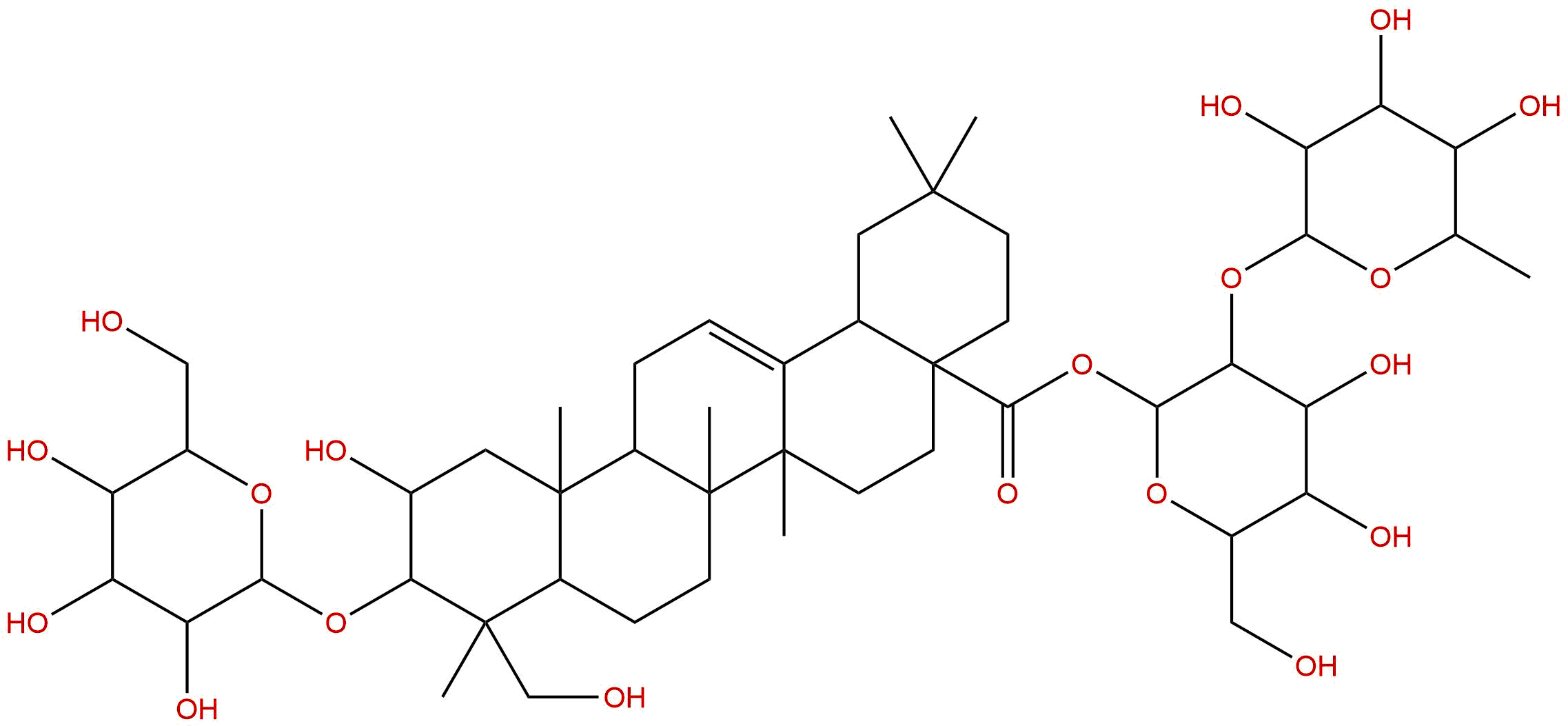 IUPAC Name: [(2S,3R,4S,5S,6R)-4,5-dihydroxy-6-(hydroxymethyl)-3-[(2S,3R,4R,5R,6S)-3,4,5-trihydroxy-6-methyloxan-2-yl]oxyoxan-2-yl] (4aS,6aR,6aS,6bR,8aR,9R,10R,11S,12aR,14bS)-11-hydroxy-9-(hydroxymethyl)-2,2,6a,6b,9,12a-hexamethyl-10-[(2R,3R,4S,5S,6R)-3,4,5-trihydroxy-6-(hydroxymethyl)oxan-2-yl]oxy-1,3,4,5,6,6a,7,8,8a,10,11,12,13,14b-tetradecahydropicene-4a-carboxylate
