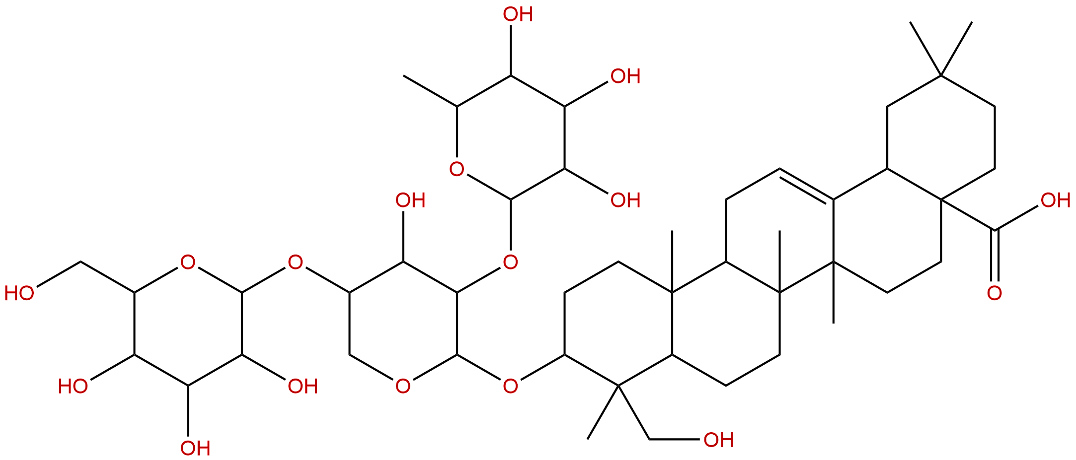 IUPAC Name: (4aS,6aR,6aS,6bR,8aR,9R,10S,12aR,14bS)-9-(hydroxymethyl)-10-[(2S,3R,4S,5S)-4-hydroxy-5-[(2S,3R,4S,5S,6R)-3,4,5-trihydroxy-6-(hydroxymethyl)oxan-2-yl]oxy-3-[(2S,3R,4R,5R,6S)-3,4,5-trihydroxy-6-methyloxan-2-yl]oxyoxan-2-yl]oxy-2,2,6a,6b,9,12a-hexamethyl-1,3,4,5,6,6a,7,8,8a,10,11,12,13,14b-tetradecahydropicene-4a-carboxylic acid