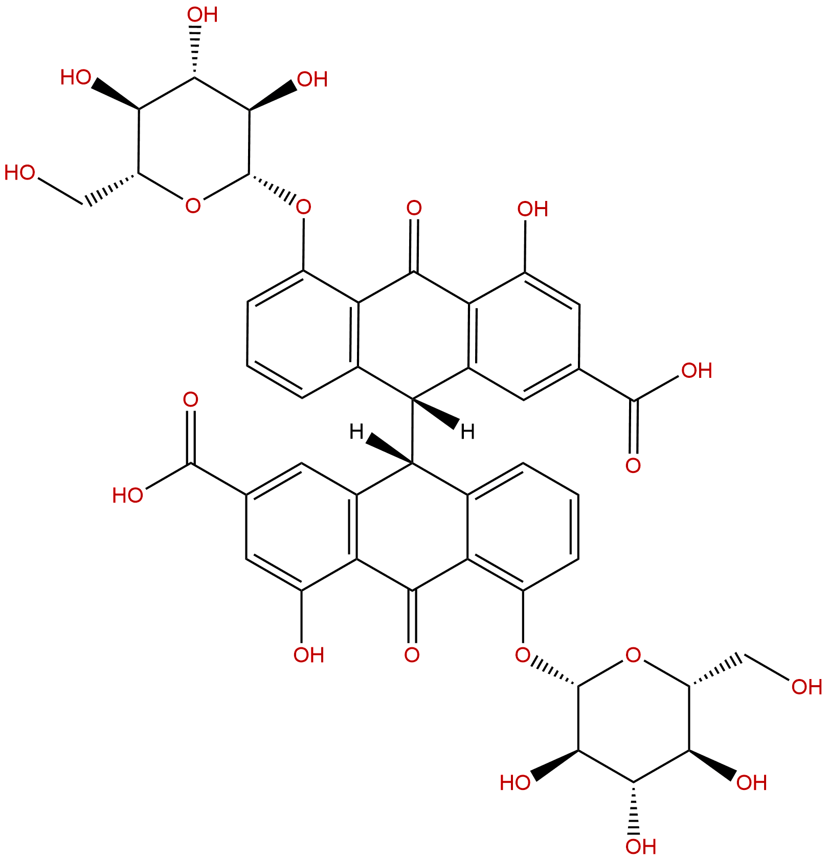 IUPAC Name: (9R)-9-[(9R)-2-carboxy-4-hydroxy-10-oxo-5-[(2S,3R,4S,5S,6R)-3,4,5-trihydroxy-6-(hydroxymethyl)oxan-2-yl]oxy-9H-anthracen-9-yl]-4-hydroxy-10-oxo-5-[(2S,3R,4S,5S,6R)-3,4,5-trihydroxy-6-(hydroxymethyl)oxan-2-yl]oxy-9H-anthracene-2-carboxylic acid