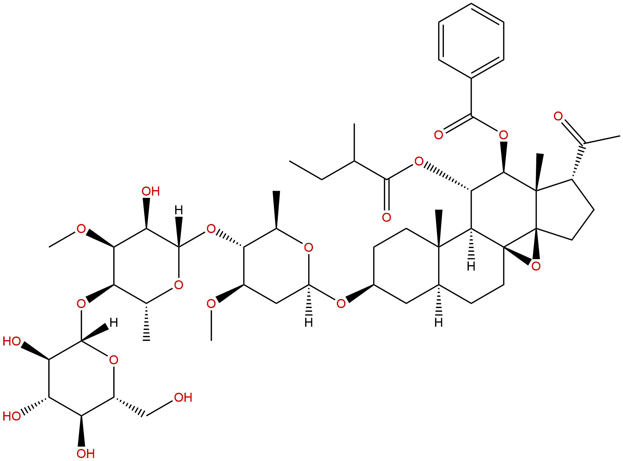 IUPAC Name: [(1S,3R,6R,7S,8S,9S,10S,11S,14S,16S)-6-acetyl-14-[(2R,4R,5R,6R)-5-[(2S,3R,4S,5R,6R)-3-hydroxy-4-methoxy-6-methyl-5-[(2S,3R,4S,5S,6R)-3,4,5-trihydroxy-6-(hydroxymethyl)oxan-2-yl]oxyoxan-2-yl]oxy-4-methoxy-6-methyloxan-2-yl]oxy-7,11-dimethyl-9-(2-methylbutanoyloxy)-2-oxapentacyclo[8.8.0.01,3.03,7.011,16]octadecan-8-yl] benzoate