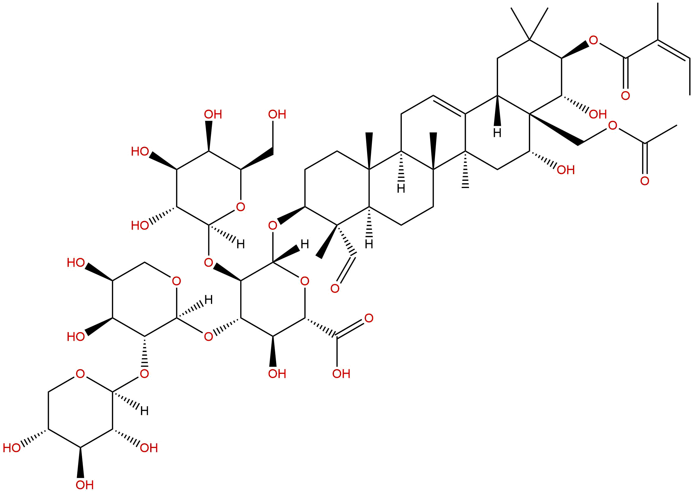 IUPAC Name: (2S,3S,4S,5R,6R)-6-[[(3S,4S,4aR,6aR,6bS,8R,8aR,9R,10R,12aS,14aR,14bR)-8a-(acetyloxymethyl)-4-formyl-8,9-dihydroxy-4,6a,6b,11,11,14b-hexamethyl-10-[(Z)-2-methylbut-2-enoyl]oxy-1,2,3,4a,5,6,7,8,9,10,12,12a,14,14a-tetradecahydropicen-3-yl]oxy]-4-[(2S,3R,4S,5S)-4,5-dihydroxy-3-[(2S,3R,4S,5R)-3,4,5-trihydroxyoxan-2-yl]oxyoxan-2-yl]oxy-3-hydroxy-5-[(2S,3R,4S,5R,6R)-3,4,5-trihydroxy-6-(hydroxymethyl)oxan-2-yl]oxyoxane-2-carboxylic acid