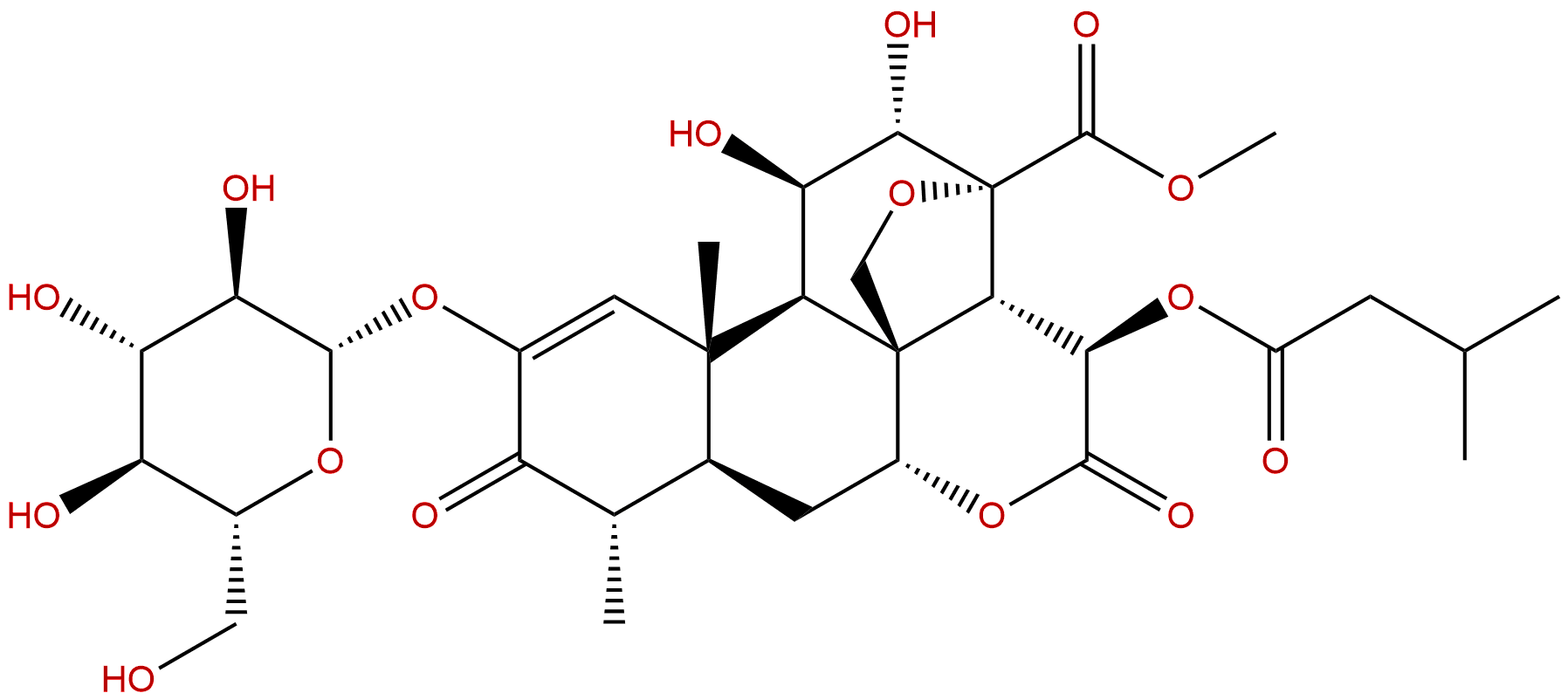 InChI: InChI=1S/C32H44O16/c1-11(2)6-17(34)48-23-25-31-10-44-32(25,29(42)43-5)26(40)22(39)24(31)30(4)8-14(18(35)12(3)13(30)7-16(31)47-27(23)41)45-28-21(38)20(37)19(36)15(9-33)46-28/h8,11-13,15-16,19-26,28,33,36-40H,6-7,9-10H2,1-5H3/t12-,13-,15+,16+,19+,20-,21+,22+,23+,24+,25+,26-,28+,30-,31+,32-/m0/s1